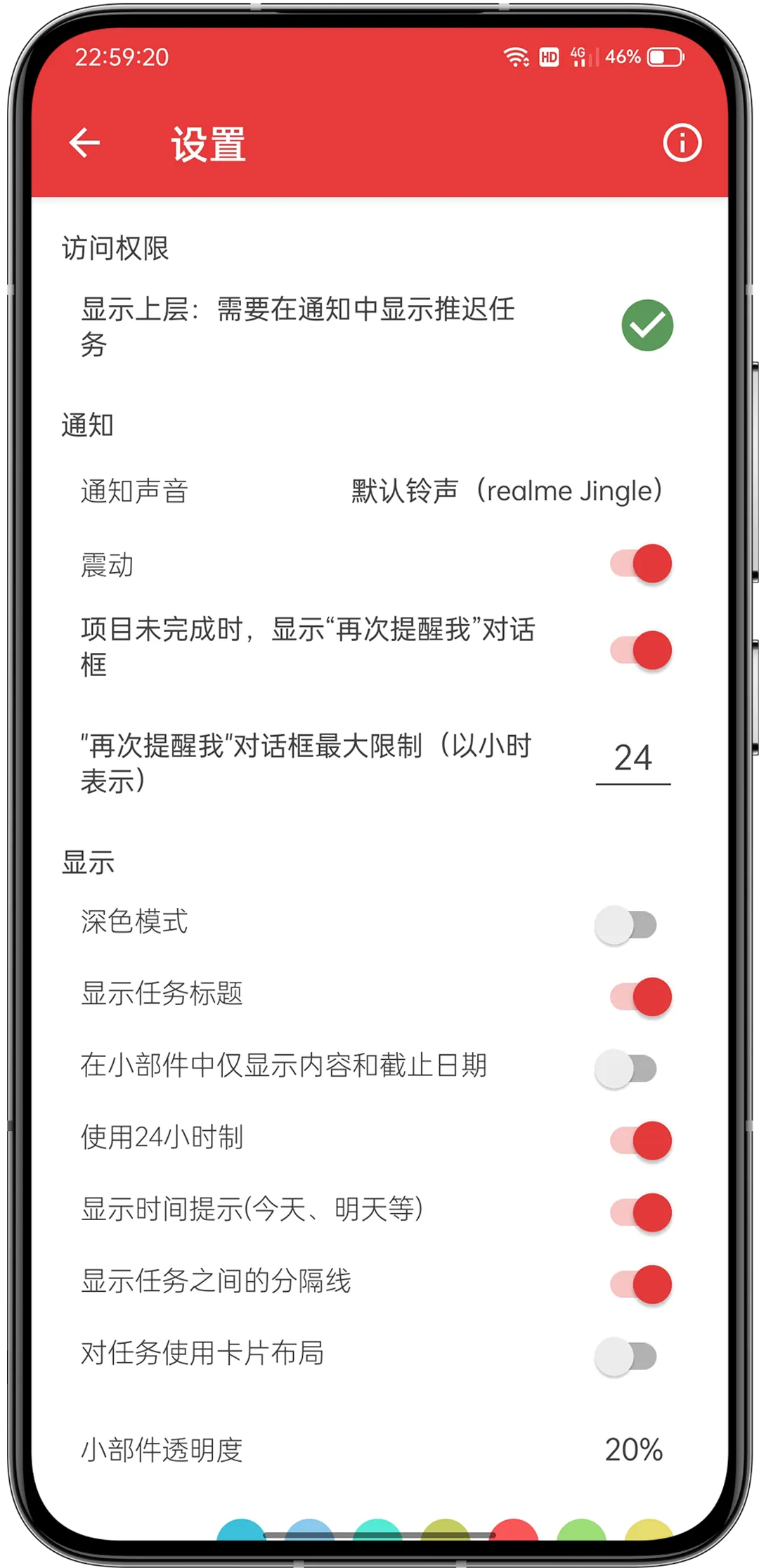 另外 APP 也提供了很多的自定义设置选项,比如是否震动提醒,是否添加待办事项的标题,是否在提醒尚未结束时显示 “再次提醒” 的字样,使用 24 小时时间制,在桌面小部件中显示具体的内容,暗色模式,以及 APP 的主题色调等等。