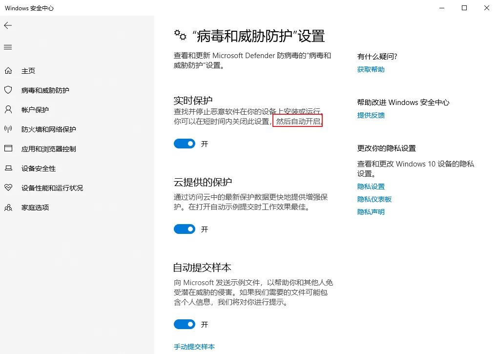 如果直接在windows的安全中心选择关闭实时保护,只能暂时关闭,因为系统会还是会自动开启。