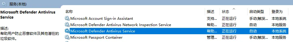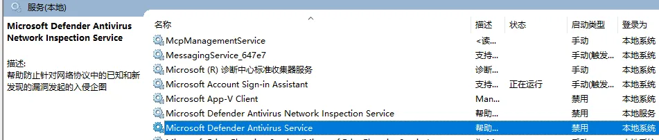 如果打开windows 服务管理,可以看到Defender Antivirus服务已被禁用。