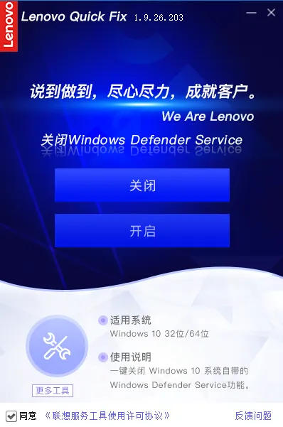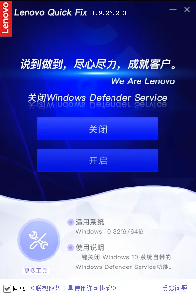 软件名称:关闭Windows Defender Service工具-Lenovo
