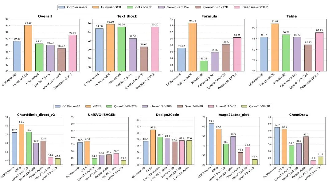 OCRVerse的模型本身是基于Qwen3-VL-4B的,这意味着它只有40亿参数。在今天动辄百亿、千亿参数的大模型时代,这绝对算是个“小模型”。那么,它的实际表现如何?能跟那些“巨无霸”们掰手腕吗?