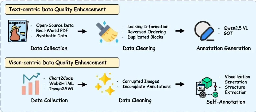 这些数据并非简单收集而来,而是经过了一套精密的“加工流水线”。如图3所示,对于文本数据,团队整合了开源数据集、真实PDF和合成数据,并通过清洗和基于大模型的重新标注来提升质量。对于视觉数据,则从图表、网页等源头收集,进行质量过滤,并通过可视化渲染和结构提取来生成高质量的“图像-代码”配对标注。
