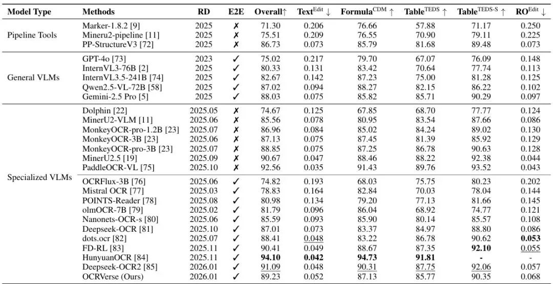 表1:在OmniDocBench v1.5上的性能对比。加粗和下划线分别表示端到端专用VLM中的最佳和次佳性能。RD:发布日期,E2E:端到端(✓)或基于流水线(X),RO:阅读顺序。