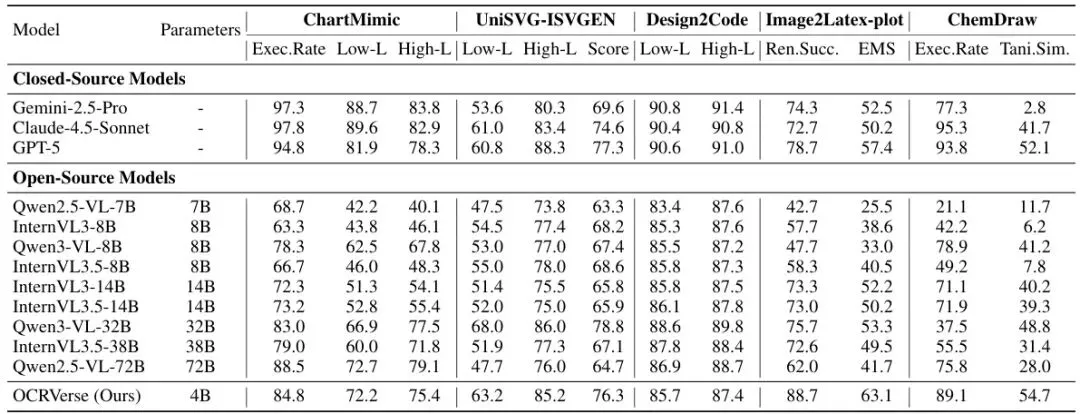 表2:在多模态代码生成基准上,OCRVerse与各种基线模型的评估结果对比。