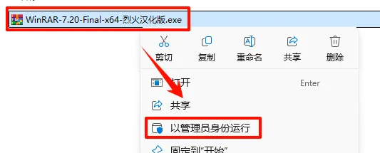1.选中下载的安装包,鼠标右键点击“WinRAR-7.20-Final-x64-烈火汉化版.exe”选择“以管理员身份运行”