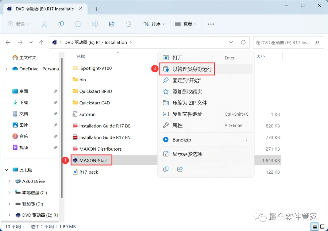 4、找到【MAXON-Start】应用程序,右键选择【以管理员身份运行】它