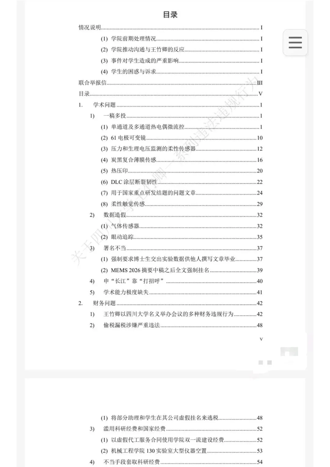 目录1. 学术问题1. 一稿多投(1) 单通道及多通道热电偶微流控(2) 61电极可变镜(3) 压力和生理电压监测的柔性传感器(4) 炭黑复合薄膜传感(5) 热压印(6) DLC涂层断裂韧性(7) 用于国家重点研发结题的问题文章(8) 柔性触觉传感2. 数据造假(1) 气体传感器(2) 眼动追踪3. 署名不当(1) 强制要求博士生交出实验数据供他人撰写文章毕业(2) MEMS 2026摘要中稿之后全文强制挂名4. 申“长江”靠“打招呼”5. 学术能力极度缺失2. 财务问题1. 王竹卿以四川大学名义举办会议的多种财务违规行为2. 税务(1) 将部分助理和学生在其公司虚假挂名来逃税3. 滥用科研经费和国家经费(1) 以虚假代工服务合同使用学院双一流建设经费(2) 机械工程学院130实验室大型仪器空置4. 不当手段套取科研经费