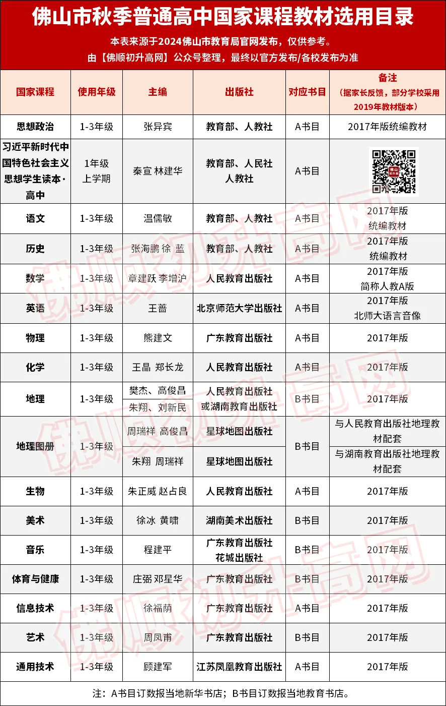 因此我们收集了佛山高中常用教材版本