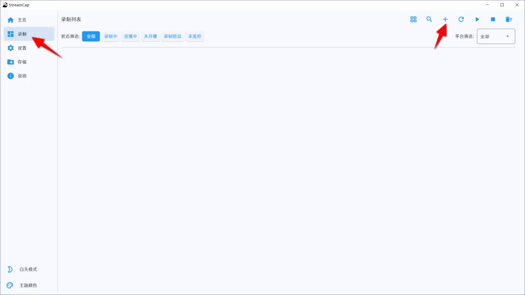 然后点击录制,点击右上角的+号,复制直播间地址并填写,名称可以留空,支持清晰度选择,最高支持原画,格式默认的TS即可,支持批量导入。
