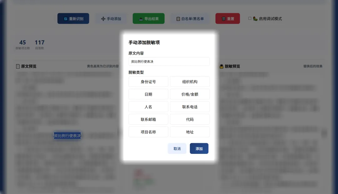 4. 编辑优化(可选):对自动识别结果进行手动删改,也可直接在原文中选中文本手动添加脱敏项;