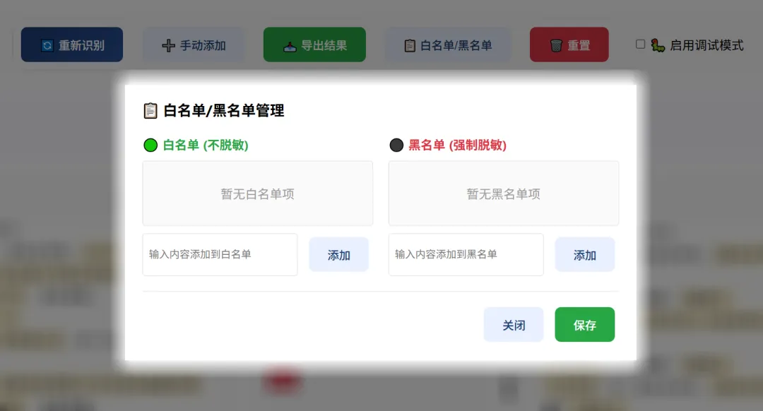 5. 白/黑配置(可选):按需添加白名单免脱敏内容、黑名单强制脱敏内容,操作后即时生效;
