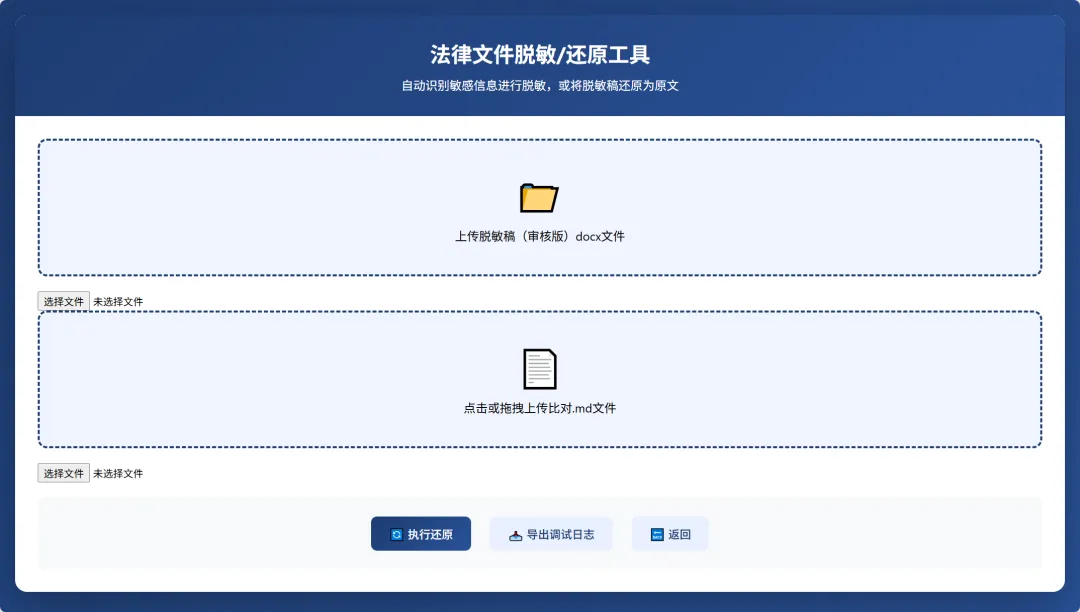 2. 上传文件:同时上传两个文件——脱敏后的docx文件 + 对应的替换比对.md文件(脱敏时导出的配套文件);