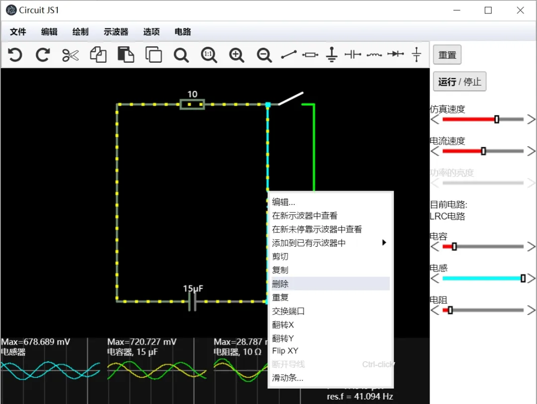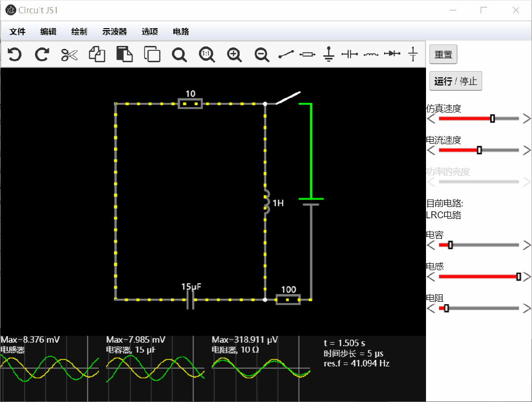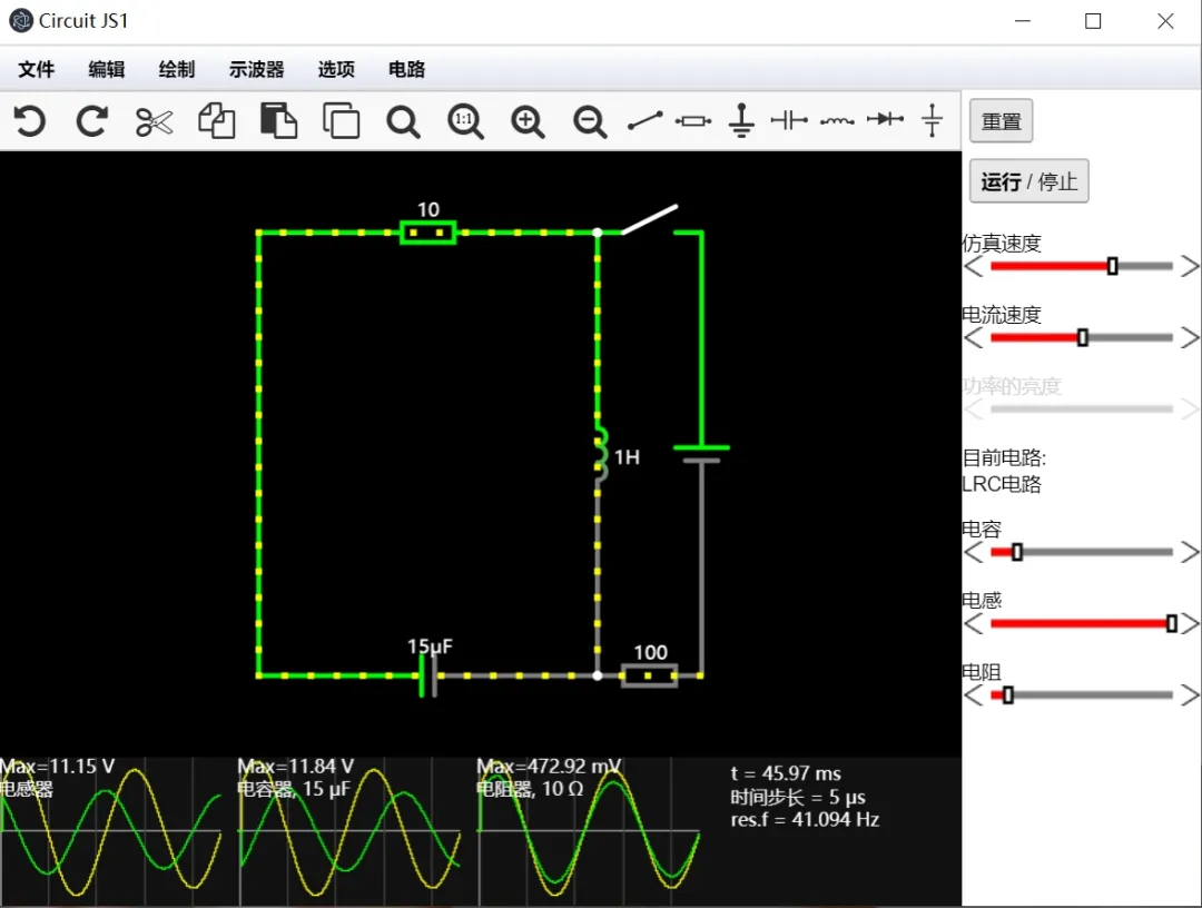 当你点击启动时,你可以看到一个简单的LRC电路的简单原理图,其中灰色表示接地,绿色表示正电压,红色表示负电压,移动的黄点代表电流。点击右侧的运行/停止按钮即可打开或者关闭。
