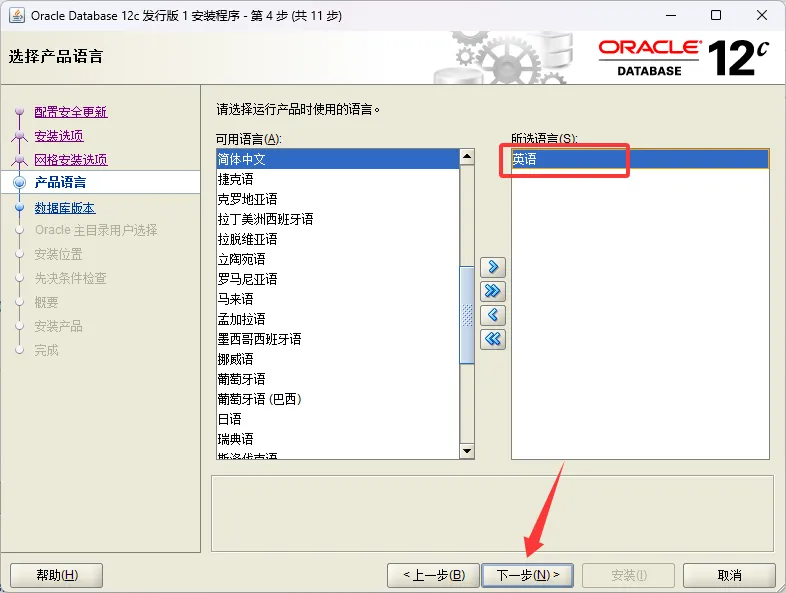 7、产品语言,仅保留英语。然后点击下一步。
