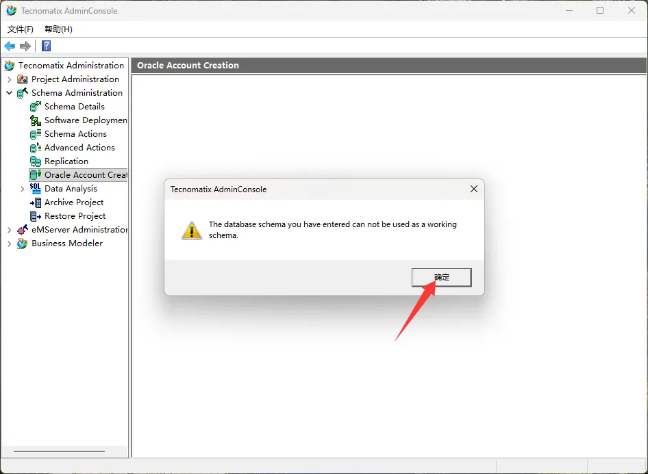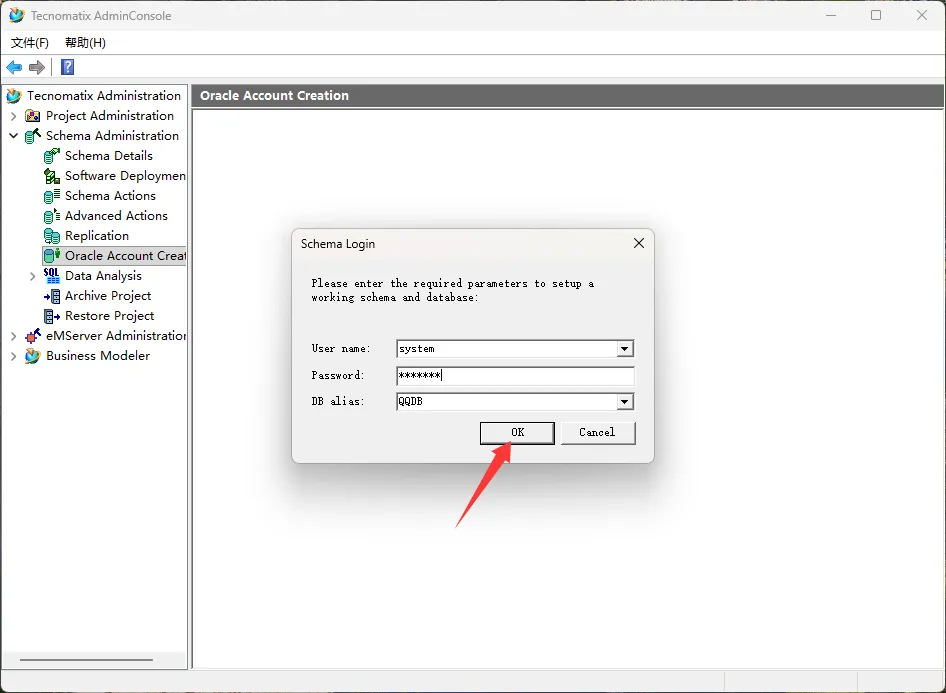 45、点击Schema Administrator→Oracle Account Creation,输入用户名:system,密码:manager,点击OK,点击确定。