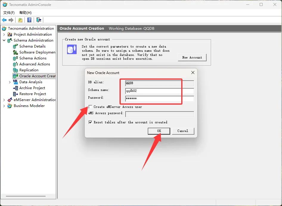 46、点击New Account,输入表空间名称及密码(自定义 ),取消Create eMServer Access User,点击OK。