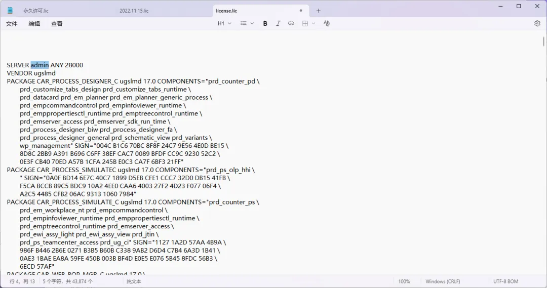 51、许可证安装,license信息更改。打开license文件讲admin替换为自己的电脑计算机名。然后保存文件备用。