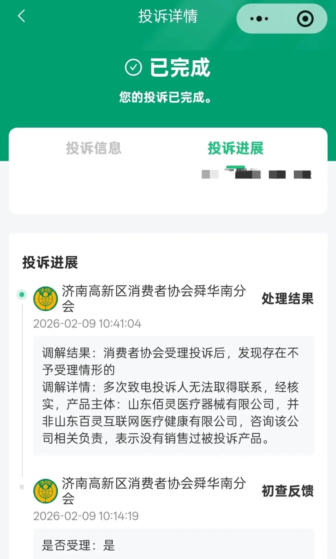 但是,等来的投诉的结果,却是大感失望。315APP平台只是发信息回复说,已把相关证据和诉求转给了销售膏贴的商贩山东佰灵医疗器械有限公司(快递上写的是山东百灵互联网医疗健康器械有限公司)所在地山东济南高新区舜华南分会消协处理。而这个消协根本没有按要求联系过通消费者,只是让佰灵公司直接与消费者联系。公司人员也只是问了一下情况,但只字未提其在电视上做过广告,并且,不承认“百灵”公司属于他们。这完全是在说假话。因为,老人明明是通过电视广告和上面的联系人电话购买的穴位贴。穴位贴上的公司名就是山东“佰灵”公司。