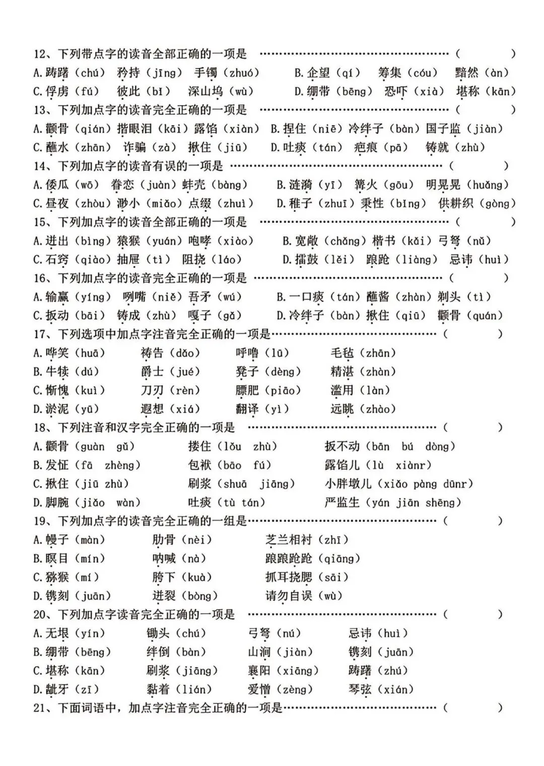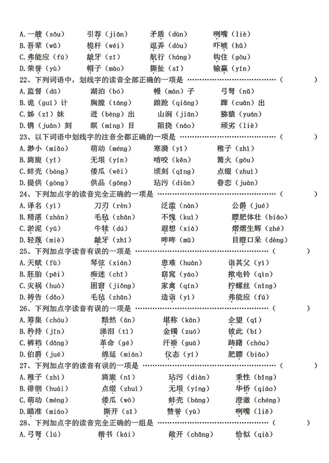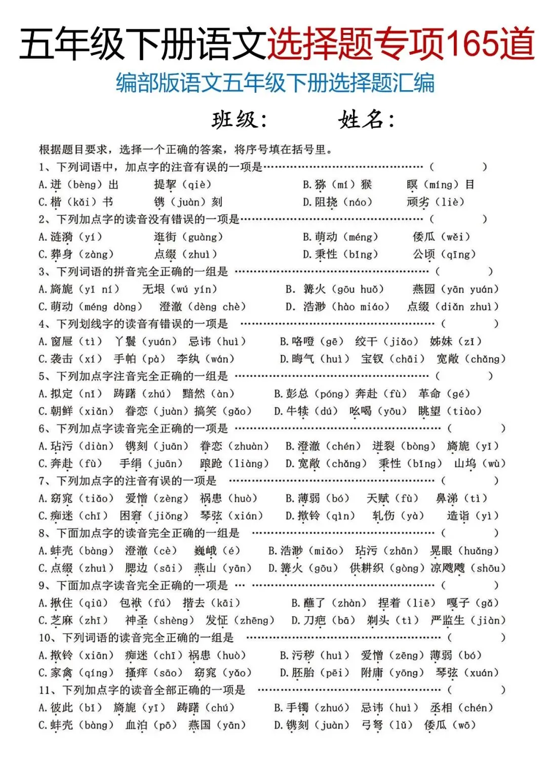 【免费下载】五年级(下)语文选择题专项165道