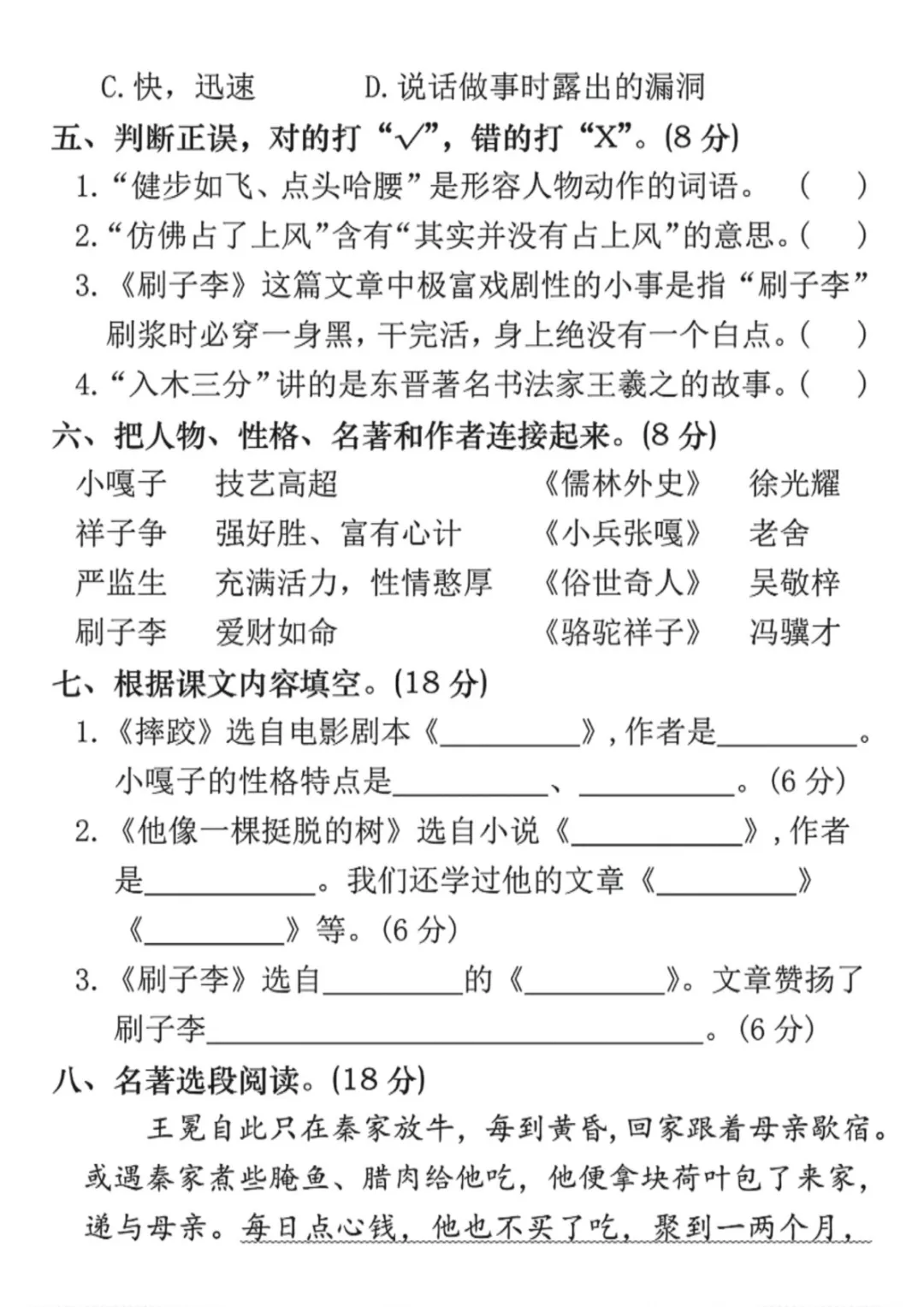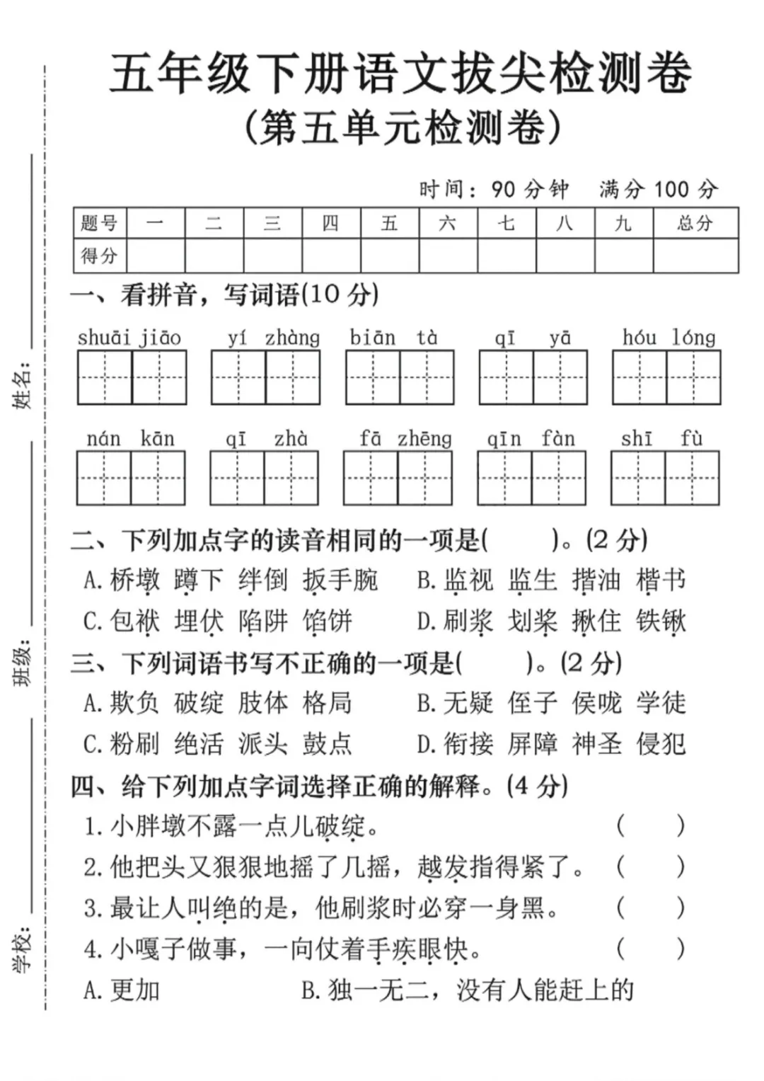 五年级(下)语文 第五单元拔尖检测卷