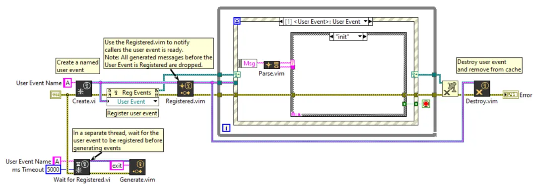 用户事件的一个问题是,如果用户事件之前没有 消息生成后,消息被丢弃(即被忽略)。为了避免初始化过程中丢弃消息, 该库添加 和 以通知调用者用户事件 准备接受消息。Registered for EventsRegistered.vimWait for Registered.vi