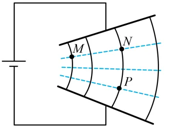 5.如图,两极板不平行的电容器与直流电源相连,极板间形成非匀强电场,实线为电场线,虚线表示等势面。M、N点在同一等势面上,N、P点在同一电场线上。下列说法正确的是()