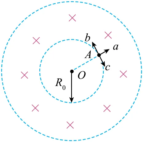 。在内圆上A点有a、b、c三个粒子均在纸面内运动,并都恰好到达磁场外边界后返回。已知a、b、c带正电且比荷均为