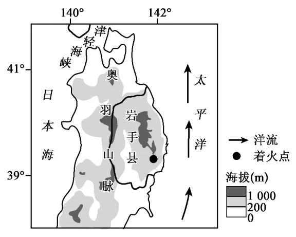 日本岩手县山区地形陡峭,针叶林茂密。2015年2月26日,该地发生日本500年来最严重的山火,过火面积达26平方千米,造成人员伤亡和数十栋建筑被焚毁,4000多人被疏散。该地当月气温异常偏高,降水仅为2.5毫米,约占常年同期的0.6,积雪覆盖率仅为常年同期的20%。如图示意岩手县位置及地形。