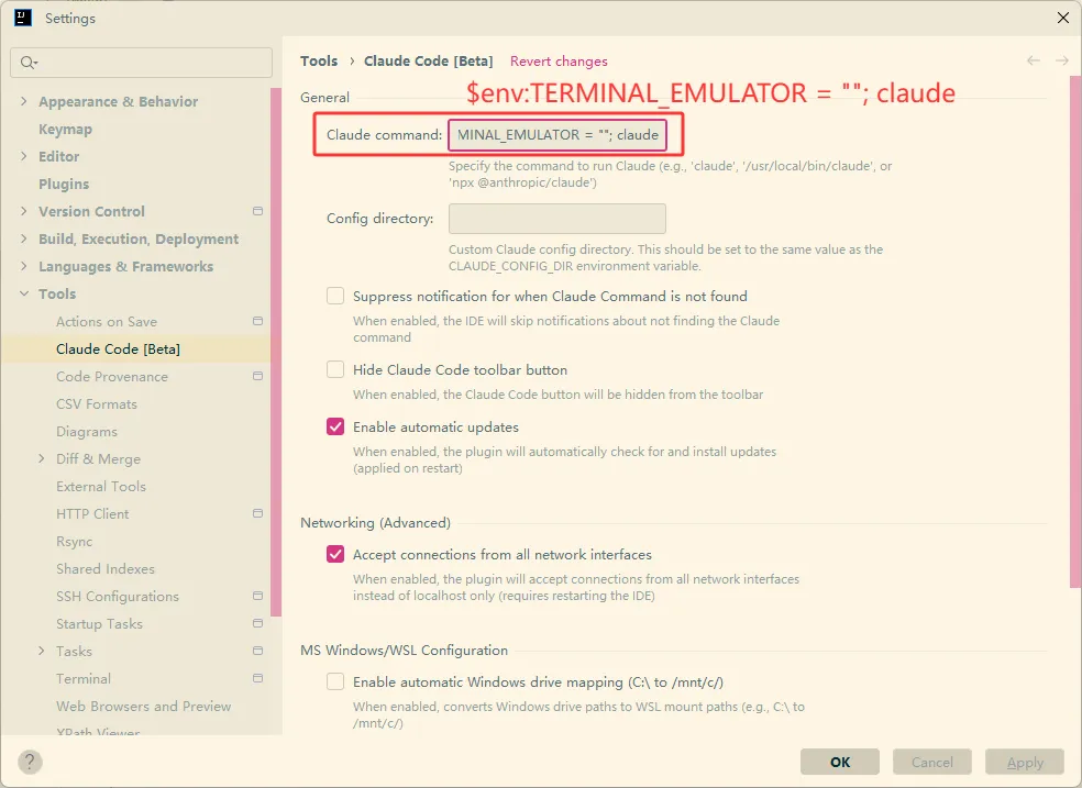 $env:TERMINAL_EMULATOR = ""; claude