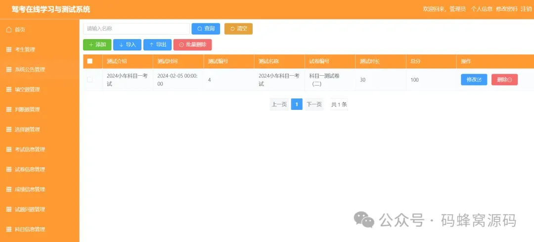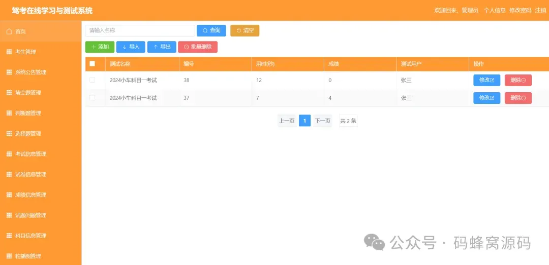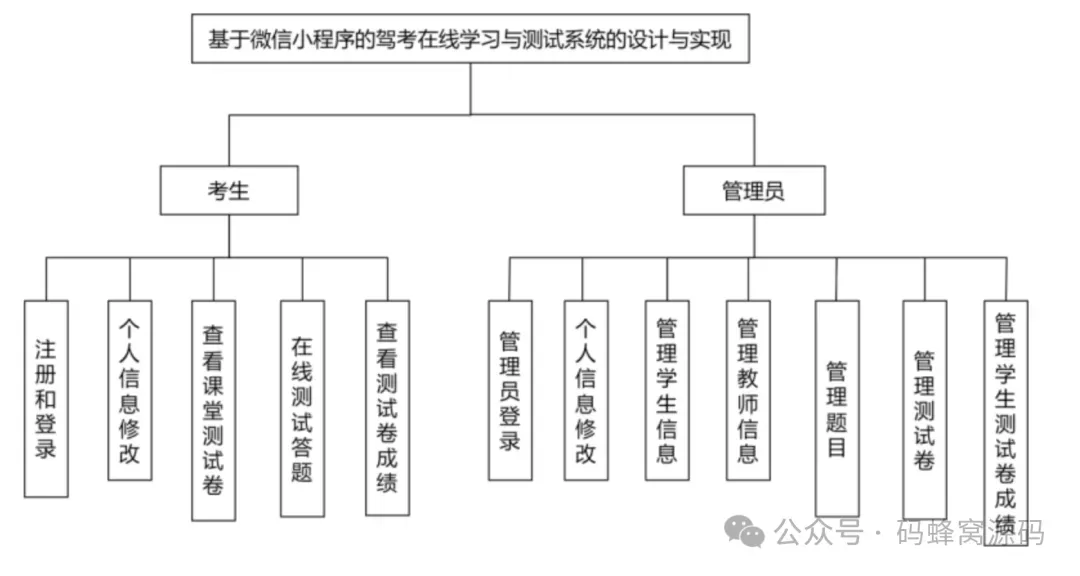 驾考在线学习与测试系统的重要核心功能包括注册和登录、学生管理、科目管理、课程测试卷管理、在线测试答题、查看测试成绩等,以下为项目功能模块图: