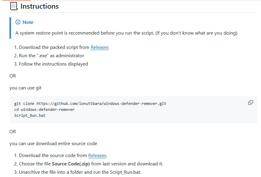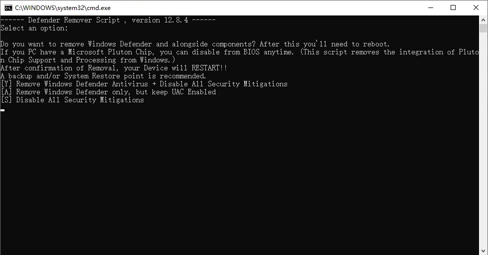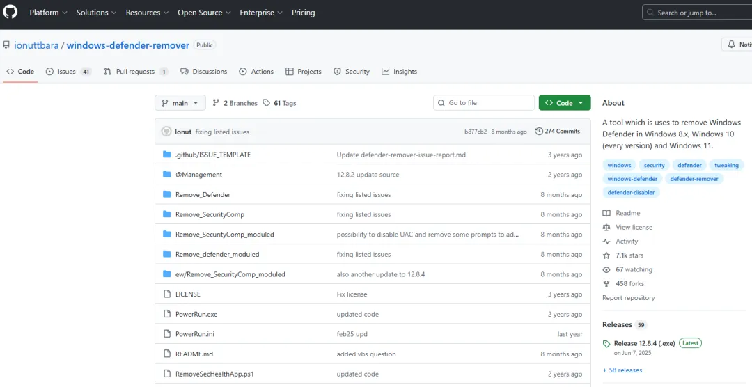 This application removes / disables Windows Defender, including the Windows Security App, Windows Virtualization-Based Security (VBS), Windows SmartScreen, Windows Security Services, Windows Web-Threat Service, Windows File Virtualization (UAC), Microsoft Defender App Guard, Microsoft Driver Block List, System Mitigations and the Windows Defender page in the Settings App on Windows 10 or later.默认原理是运行相关的Powershell脚本,来实现功能。除了直接运行软件,也可以下载源代码来直接运行bat运行平台:Windows 8.x, Windows 10 和 Windows 11当前版本:12.8.4是否收费:免费下载链接: