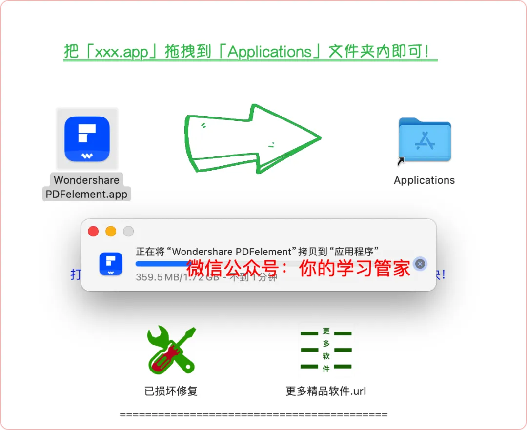 4、把【Wondershare PDFelement 】拖拽到【Applications】文件夹内即可安装;