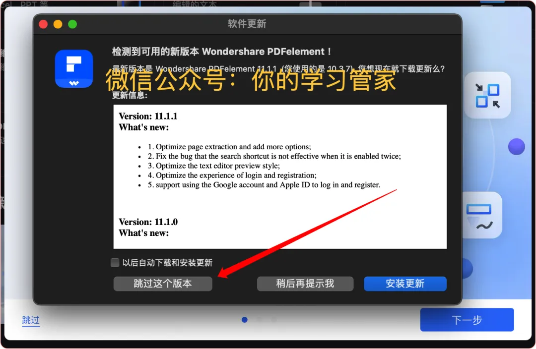 7、取消勾选自动下载,跳过这个版本;