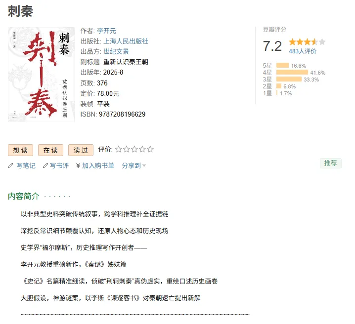 本书深耕《史记》名篇,结合出土简牍与跨学科考据,侦破刺秦事件的真伪虚实,拆解荆轲失败的多重原因,还颠覆了秦王相貌、焚书坑儒等传统定论。作者以 “侦探式” 推理,还原刺秦背后的战国政治博弈,更大胆推演刺秦成功的历史可能性。