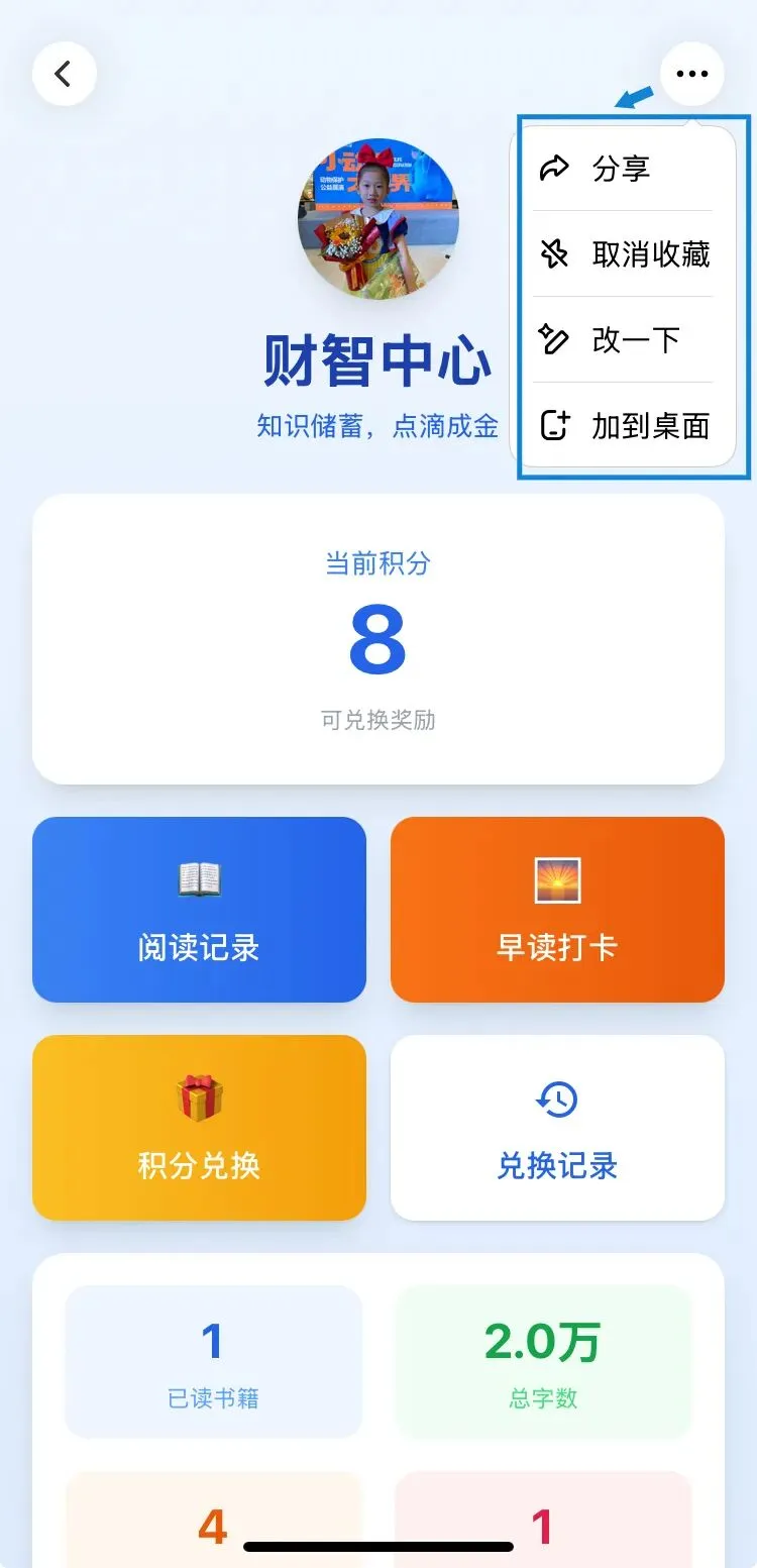 2、阅读记录积分规则:完成一本书的阅读可积累1积分,每本书需手动输入书籍名称和字数;额外设置阶梯奖励,阅读满2万字奖励2积分,阅读满5万字奖励5积分。
