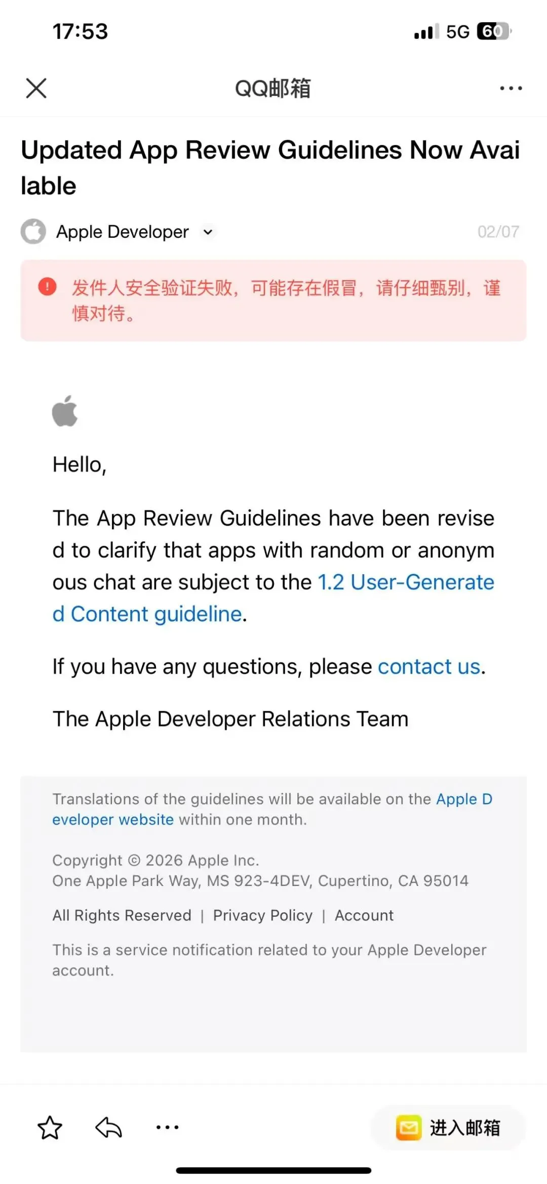 苹果在2月7日更新苹果开发者指南。此次对《App 审核指南》的更新,核心是将 “随机 / 匿名聊天” 等 UGC 高风险场景纳入 “无需通知即可移除” 清单,对陌生人社交类应用的合规门槛大幅抬升,开发者需从实名认证、内容审核、风控机制三方面全面升级,否则将面临下架与账号封禁风险。