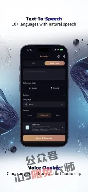 【Echovo – TTS & Voice Cloning】一款文本转语音与语音克隆应用,提供两种模式——输入文字即可生成自然流畅的语音,或通过录制几秒音频快速克隆任意人声,支持11种语言,所有处理均在设备端完成。