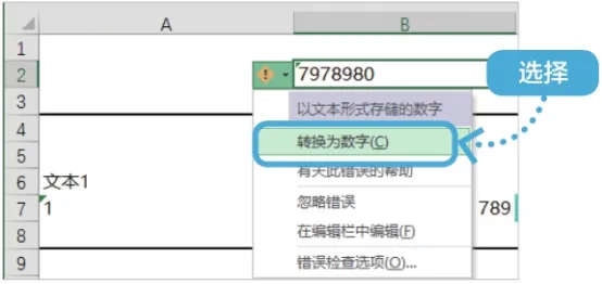 选择B2单元格,单击B2单元格左侧的下拉箭头,在弹出的下拉列表中选择【转换为数字】选项。★