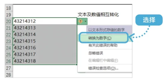 选择要转化为数值型数据的单元格区域A20:A26,单击单元格右侧的下拉按钮,选择【转换为数字】选项。★