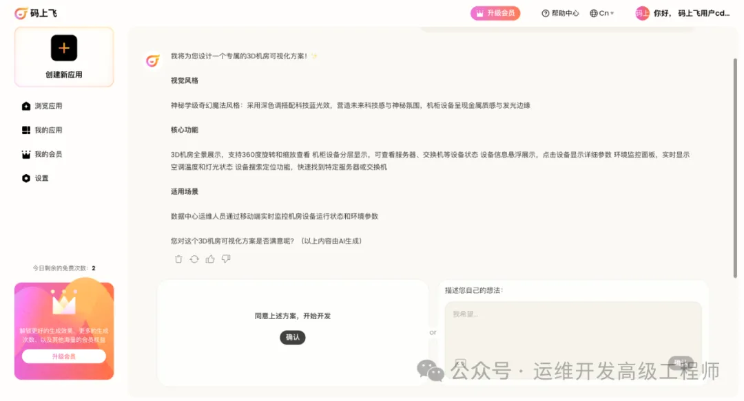 码上飞采用多Agent混用大模型的方法来进行应用的生成与开发,通过理解人的语言描述来生成满足需求的应用,如果你有需要,赶快去官网尝试吧