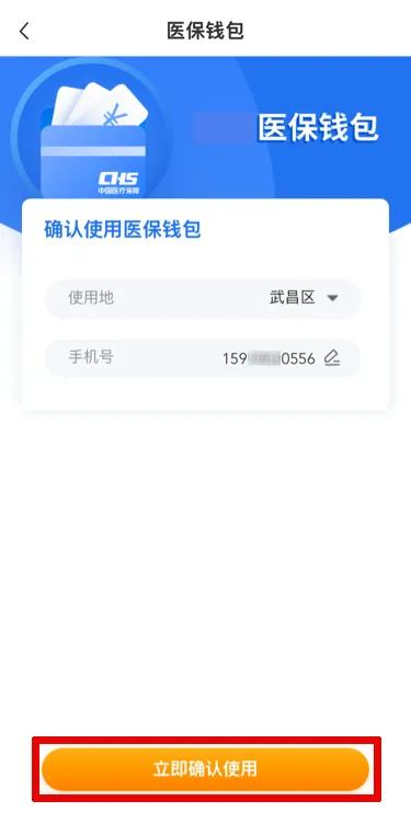 4.按流程进入下一步,核对家人钱包使用地并输入手机号,点击【立即确认使用】开通