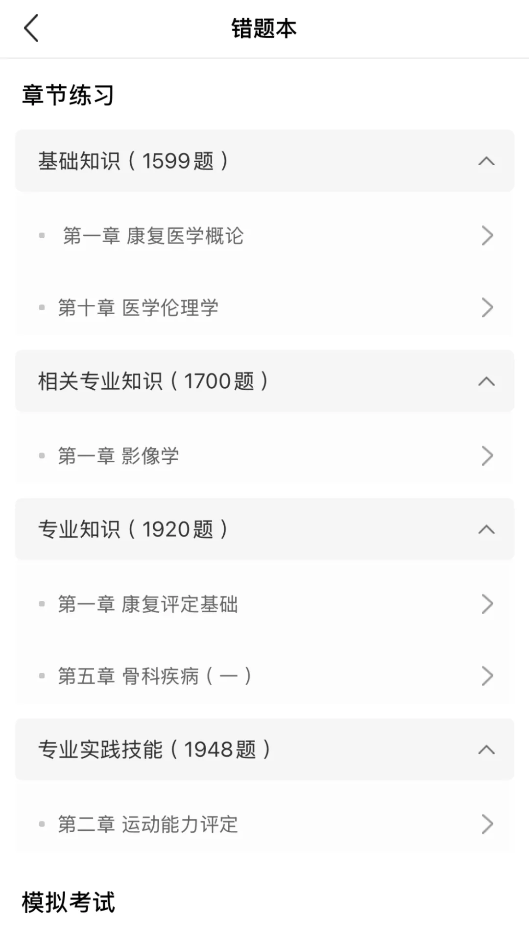 我们针对不同考试级别,分别精心配置了两套模拟试卷。每套试卷覆盖康复医学四大核心科目,总题量达400道,高度贴合考纲要求。