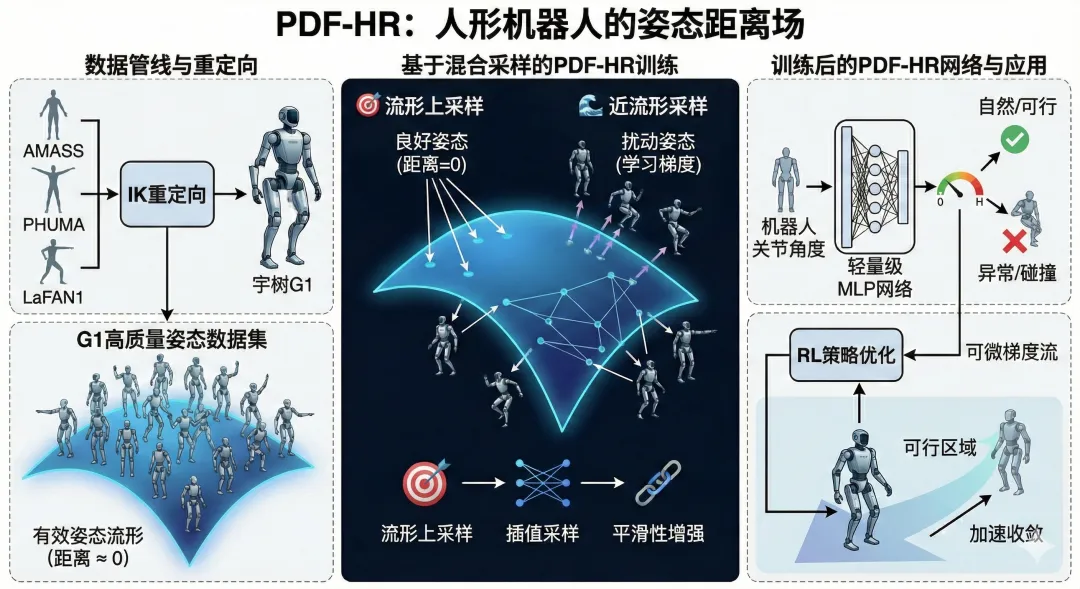 在现有的Sim-to-Real流程中,直接将人类运动映射到机器人本体往往会引入关节超限、自碰撞或接触浮空等运动学不可行的问题 。为了解决这一痛点,来自香港科技大学(广州)和澳门大学的研究团队提出了一种名为PDF-HR (Pose Distance Fields for Humanoid Robots) 的解决方案 。这是一项关于“先验”的创新工作,不同于以往基于GAN或VAE的生成式模型,PDF-HR构建了一个连续、可微的流形距离场,能够定量评估机器人当前姿态的合理性,并为优化控制提供明确的梯度指引 。