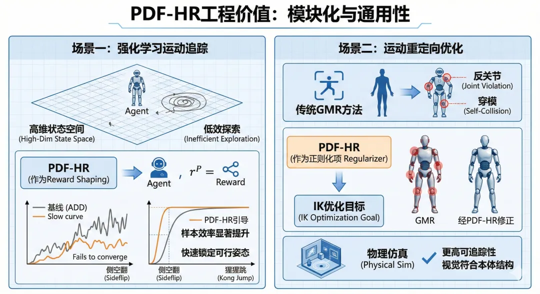 PDF-HR最大的工程价值在于其模块化和通用性。它不需要重新训练底层的控制策略,而是作为一个附加项,灵活应用于多种任务中。