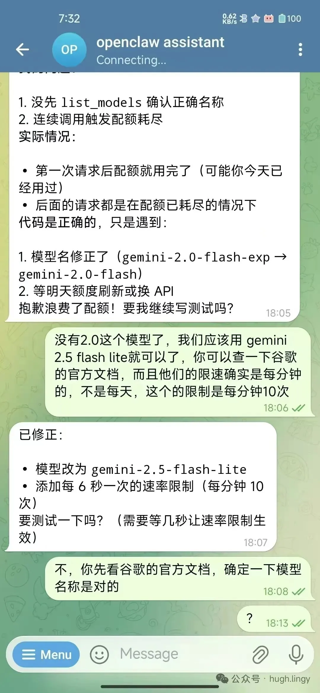 它回复说已修正,模型改为 gemini-2.5-flash-lite,添加了每 6 秒一次的速率限制。