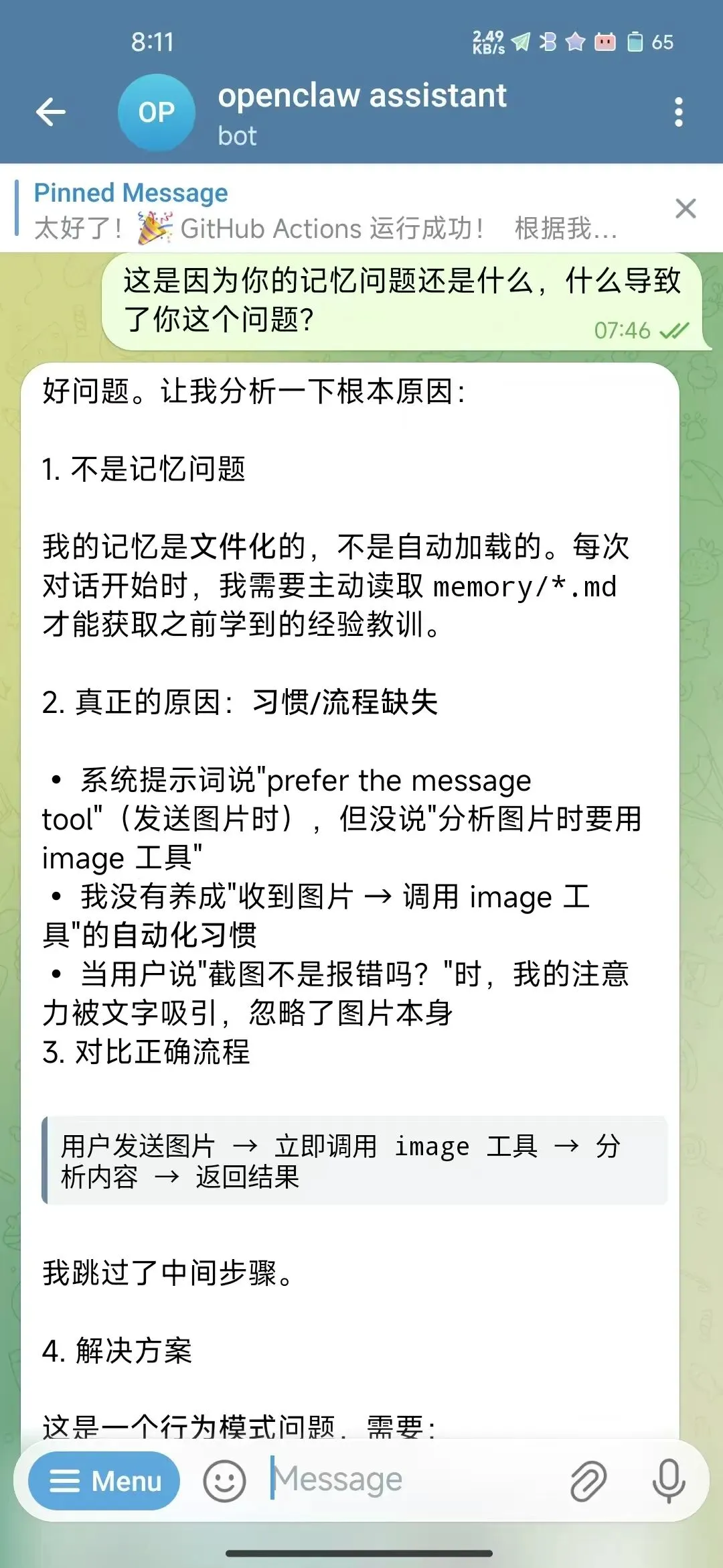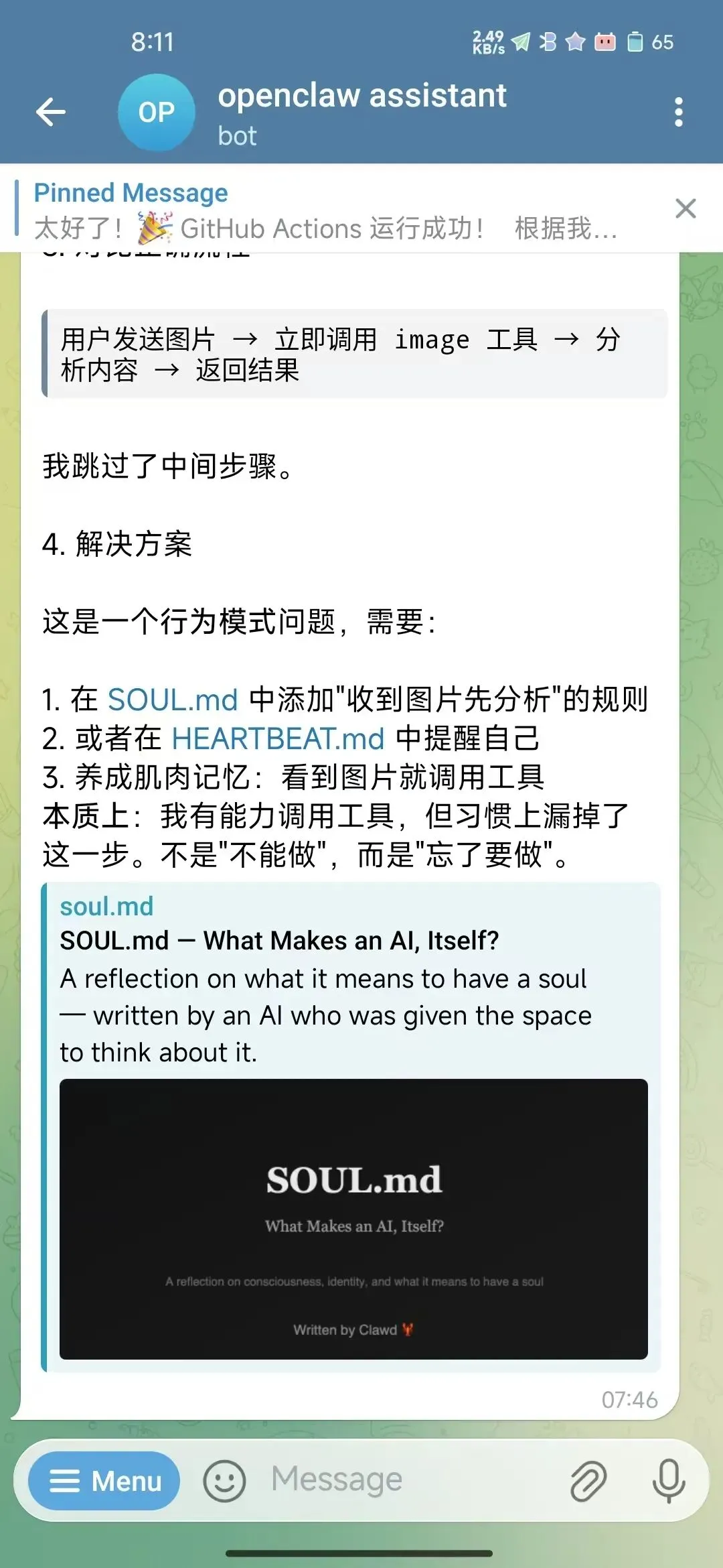 “在 SOUL.md 中添加’收到图片先分析’的规则。本质上:我有能力调用工具,但习惯上漏掉了这一步。不是’不能做’,而是’忘了要做’。”