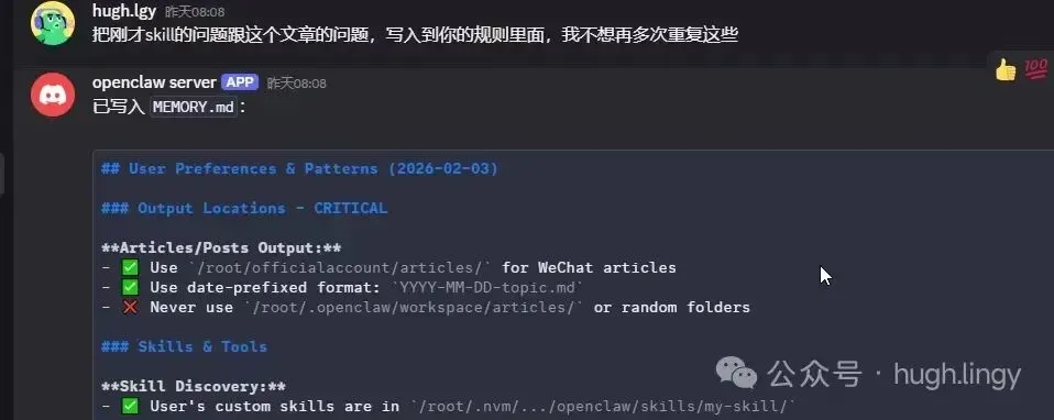 这段对话完美诠释了 OpenClaw 的记忆架构:记忆是文件化的,需要主动加载,行为习惯需要通过 SOUL.md 和 HEARTBEAT.md 来”训练”。