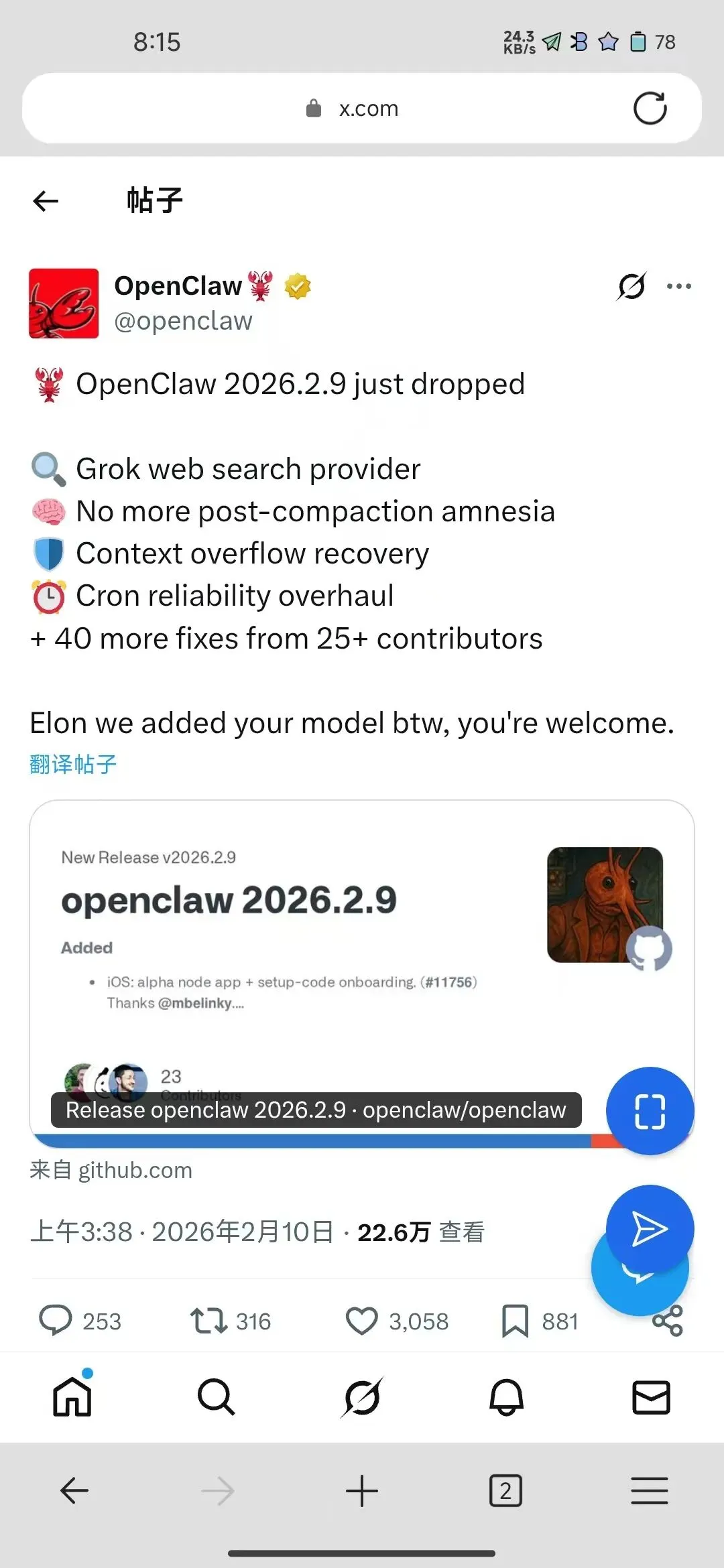 v2026.2.9 在一个版本里同时加了 Grok search、修复了上下文溢出恢复、解决了压缩后失忆——每个新模型发布和每次架构修复都是用户的免费升级。
