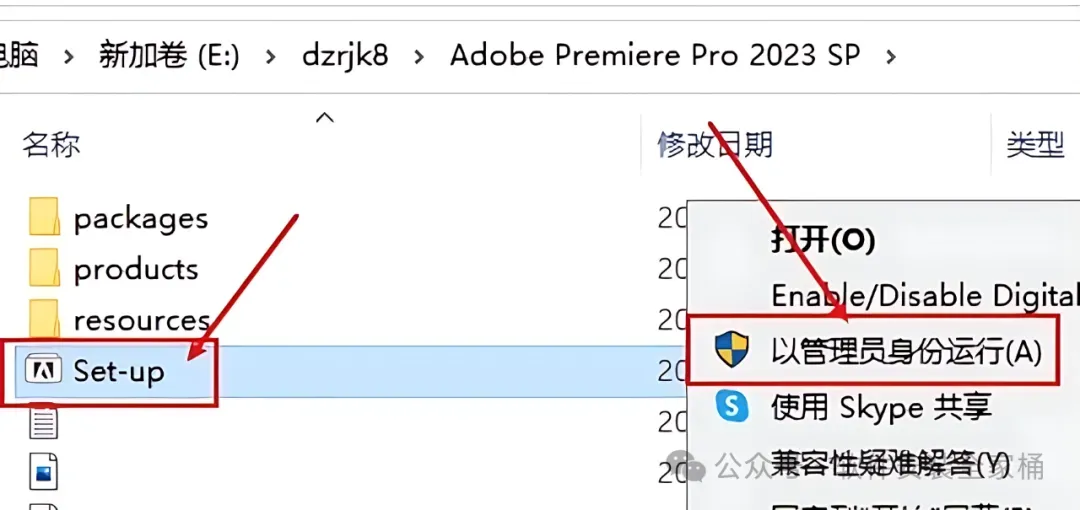 2.双击打开解压出来的Adobe Premiere Pro 2023 SP文件夹;鼠标右击【Set-up】安装程序,选择【以管理员身份运行】。