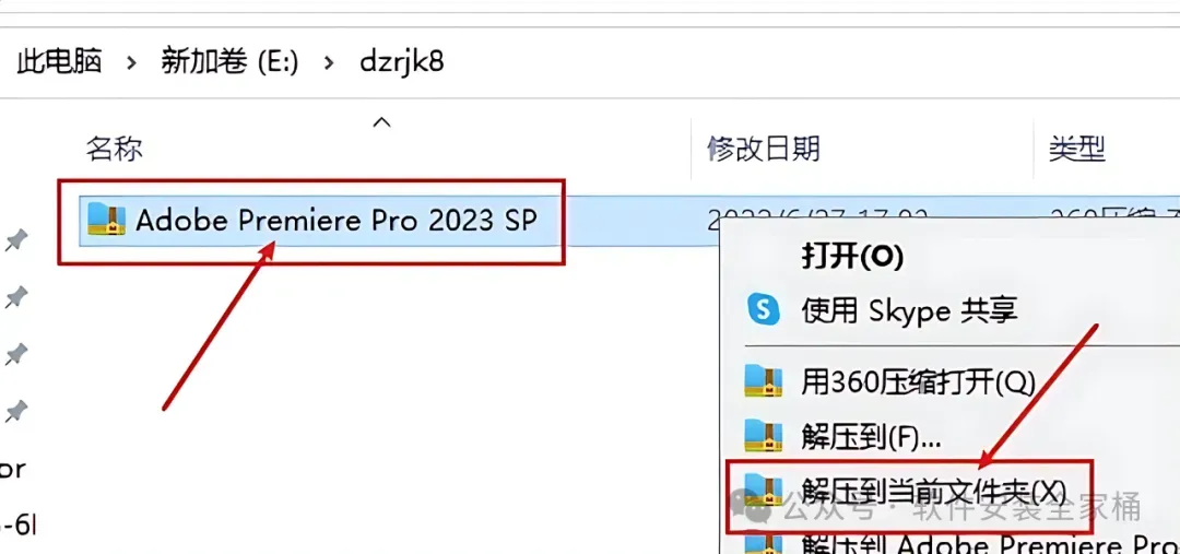 1.打开下载好的Pr软件安装包,鼠标右击压缩包选择【解压到当前文件夹】